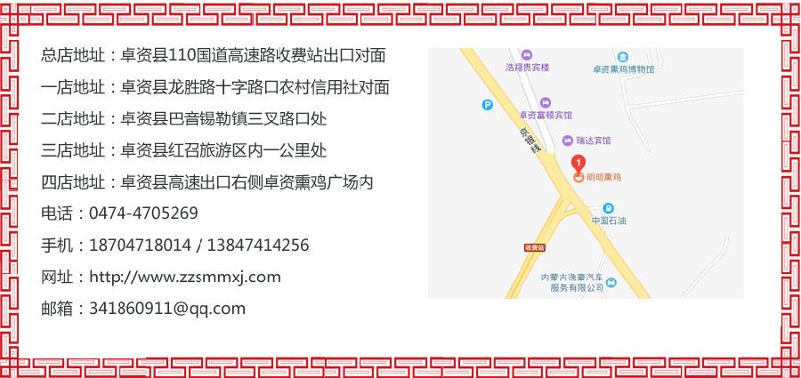 四店地址:卓资县高速出口右侧卓资熏鸡广场内